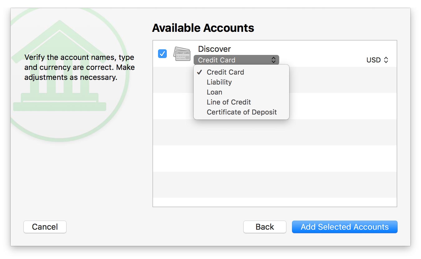 If you are adding new accounts, check off the accounts you wish to use in Banktivity. A checkbox may be disabled if you are already using that account in your Banktivity ledger. To rename the account before adding it to your ledger, click on its name and make the necessary changes. To change the account type and/or currency, click on the current setting and select an alternative from the drop-down menu. Once you have all the accounts set up the way you want them, click "Add Selected Accounts."
