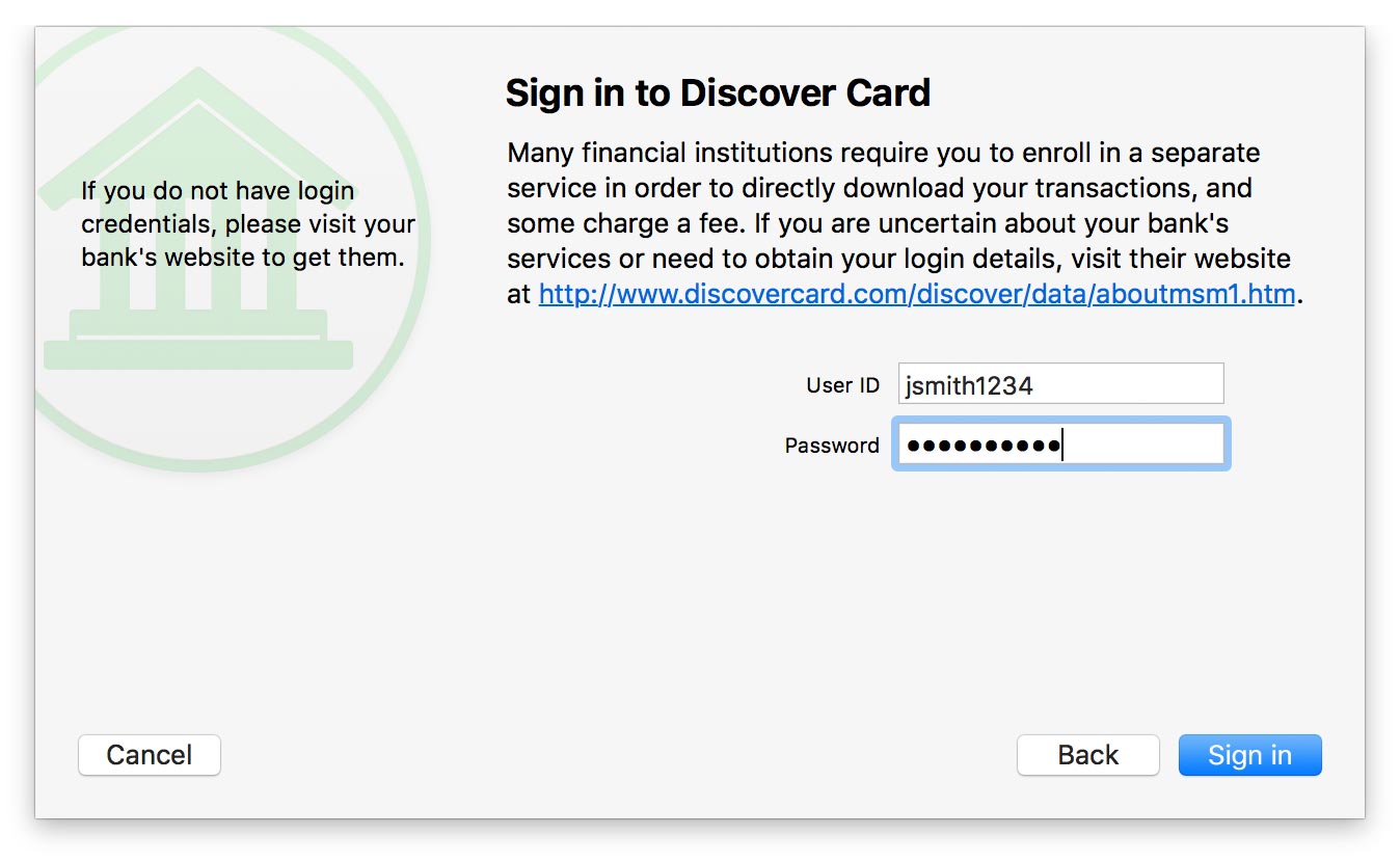 Next, Banktivity will prompt you to enter the login details for your financial institution: