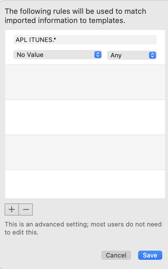 In general, Banktivity will manage import rules behind the scenes and you shouldn't need to edit them manually, however Banktivity does allow you to tweak the rules it creates to better suit your workflow. Use the plus (+) and minus (-) buttons at the bottom of the popup window to add and remove, respectively, the rules that will determine which transactions are modified by the memorized payee. You can change the following options on each rule:
