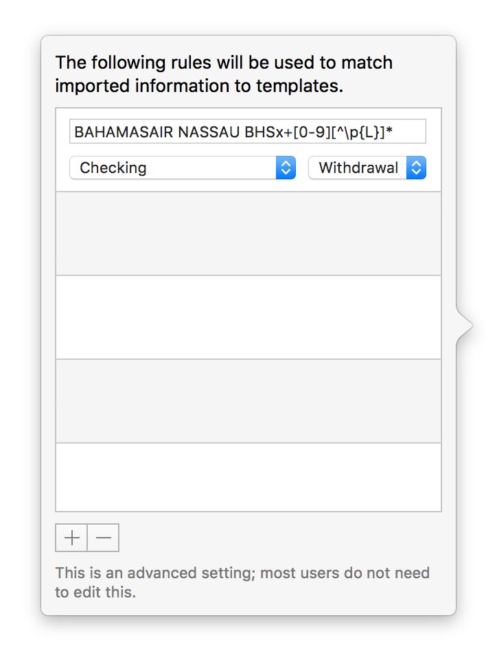 Banktivity uses regular expressions to match with the details of the transactions you download. You can see that this rule is configured to look for any transactions that match the regex statement "BAHAMASAIR NASSAU BHSx+[0-9][^\p{L}]*." Any incoming transactions that match this rules will have the memorized payee details applied to them (in this case, the payee "Bahamas Air" and the category "Travel") before they are saved to the account.