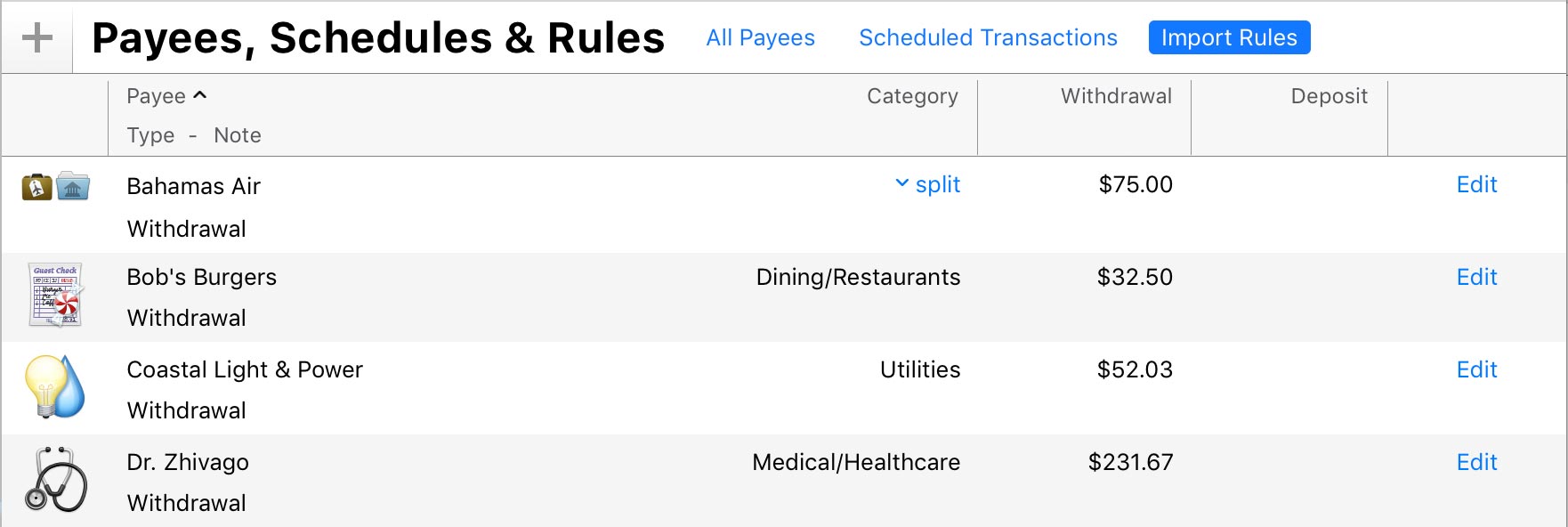 Behind the scenes, Banktivity creates import rules based on memorized payees. All payees that have import rules attached to them are tested against every transaction you import. If an incoming transaction satisfies the conditions of the import rules, the transaction is given the memorized transaction type, payee, category, splits, and tags. For more information about memorized payees, see Memorized Payees.