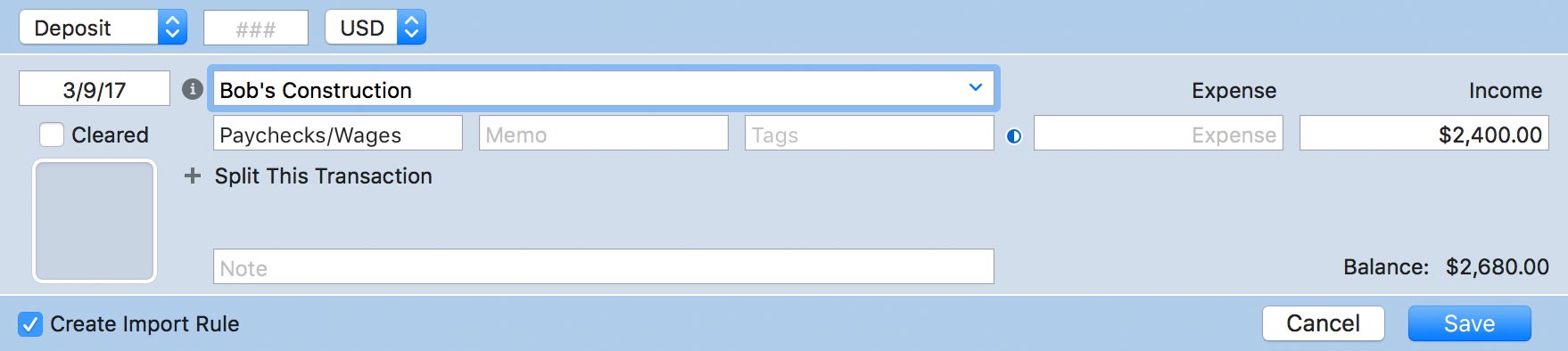 To use import rules, first update your accounts using Direct Access, direct download, web download, or file import. Once the import is complete, view an account that contains new transactions, and select a transaction that you want to modify. Whenever you edit a transaction that was imported (not recorded manually), you will see a checkbox labeled "Create Import Rule" in the transaction editor: