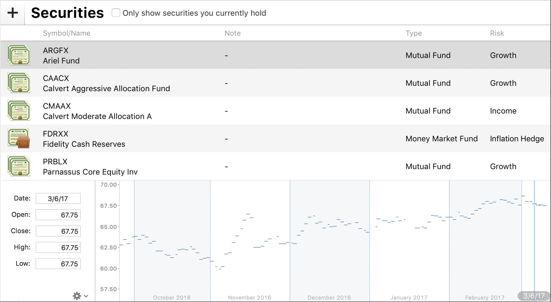 Even if you don't own any shares of a particular security, you can still add it to the securities table in order to track it as a watchlist item - simply follow the same steps described above to add the security. The only functional difference between a watchlist item and an active security is that the latter has investment transactions associated with it. Both types of securities are displayed the same way in the securities list.