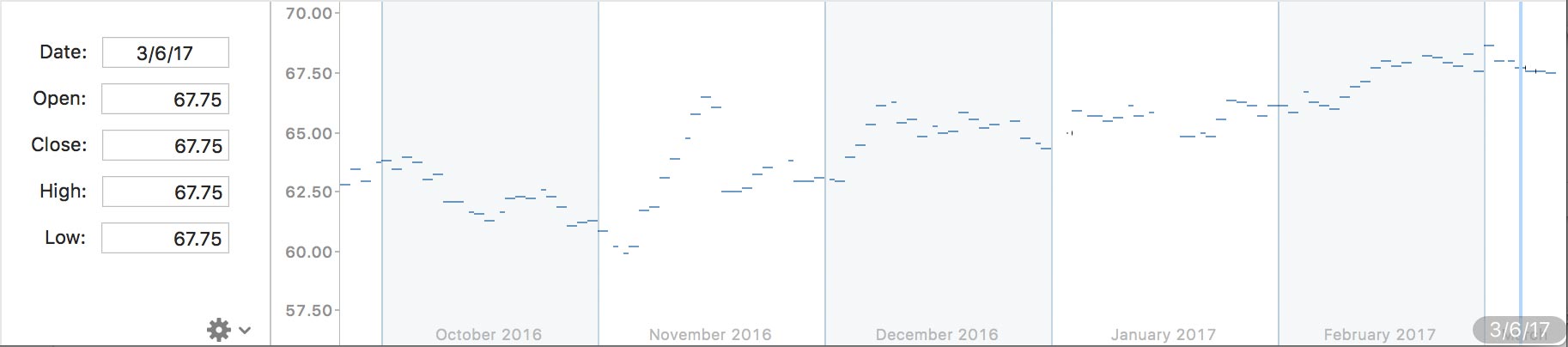 Each data point on the graph consists of three lines representing four bits of information for a particular day: the horizontal tick on the left indicates the security's opening price, the vertical line indicates the high and low prices, and the horizontal tick on the right indicates the closing price. Click on one of these data points to view the exact figures to the left.