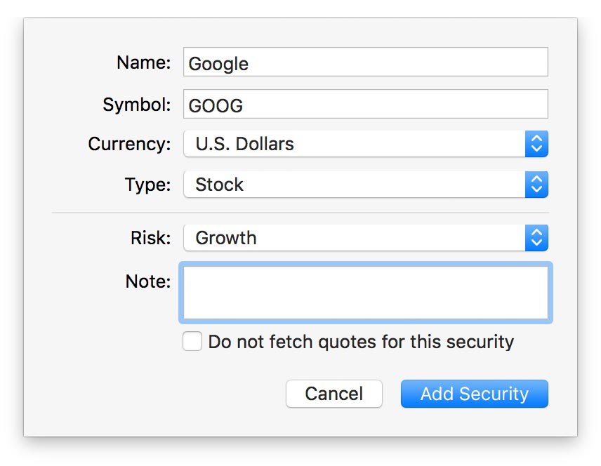 Do not fetch quotes for this security: Check this box to disable quote downloads and record prices manually for this item (such as when the security is not traded on a public exchange). This setting only appears if you choose a type that Banktivity can download quotes for.