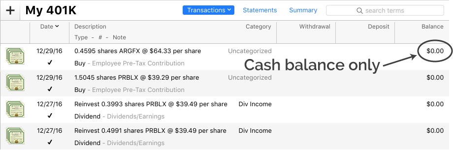 This figure reflects the amount of unallocated cash in your brokerage account only. In most cases, cash is not actually held in your brokerage account for long - when you purchase shares of a stock, you transfer the money to your broker and then it is immediately spent to purchase securities. When you receive money from the sale of a stock, the money is usually transferred into a savings or other account immediately. In most cases, the cash balance of your investment account will remain at 0. This figure is shown in the "Balance" column in the account register: