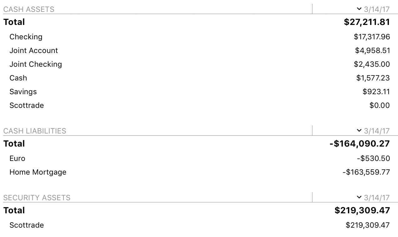 Immediately below the net worth bar chart is a table summarizing your total assets, total liabilities, and net worth on the end date of the report. Below that are tables detailing your cash assets, cash liabilities, security assets, and security liabilities by account. Account names are shown in the left column, and their values are shown to the right, with totals for each table shown at the top. If you are using a comparison period, two sets of totals are shown, one for each date range.