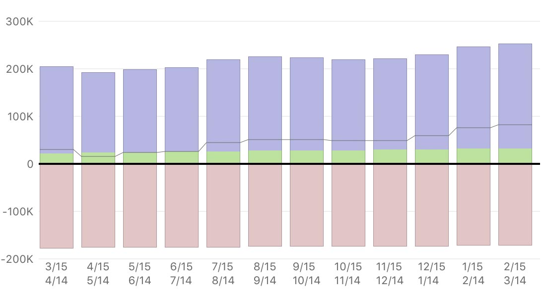 This is a bar chart depicting your net worth over the range of dates covered by the report. Each bar represents the total value of your accounts at a specific interval. Assets are drawn above the horizontal axis and consist of cash (money you have on hand, in purple) and securities (cost basis of shares you hold, in green). Liabilities are drawn below the axis and consist of cash (money you owe, in dark pink) and securities (cost basis of short sales, in light pink). The gray line indicates your net worth at each interval. If you are using a comparison period, two sets of bars will be shown at each interval. The light-colored bars on the left represent the comparison data.