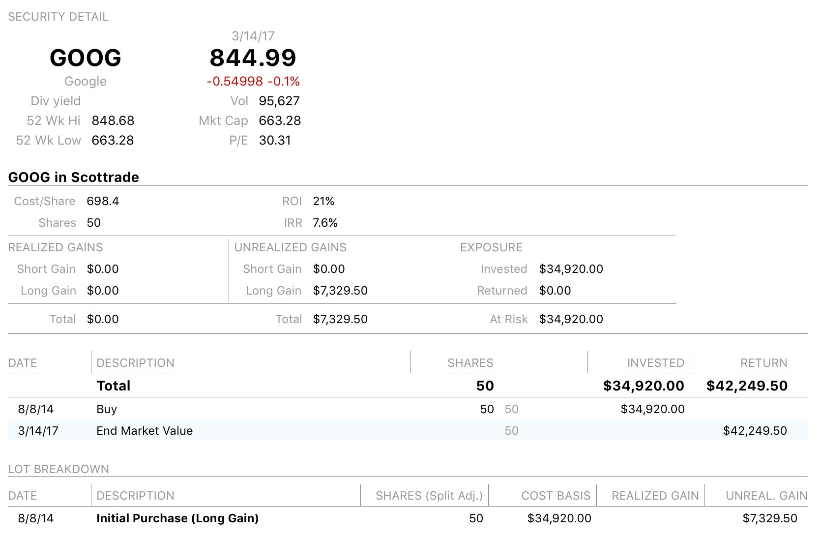 This table details your security lots. Each position that you opened is listed in bold text with its date of purchase, number of shares (adjusted for splits), and cost basis. Each sale pertaining to the lot is listed in plain text underneath, with its date, number of shares, and realized gain. Remaining shares in each lot are shown with the number of shares left, the cost basis pertaining to those shares, and the current value of unrealized gains. In the description column, short and long term gains are indicated where appropriate.