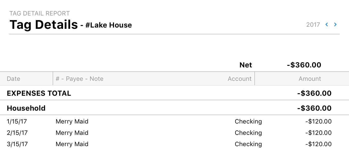 The left column shows all the tags you assigned to transactions (or to split items under transactions) within the date range covered by the report. To the right is the number of transactions and split items each tag is assigned to, followed by the total amount of income and expenses corresponding to those transactions and splits. Click on any tag to drill down and view a Tag Detail report for that item (see below).