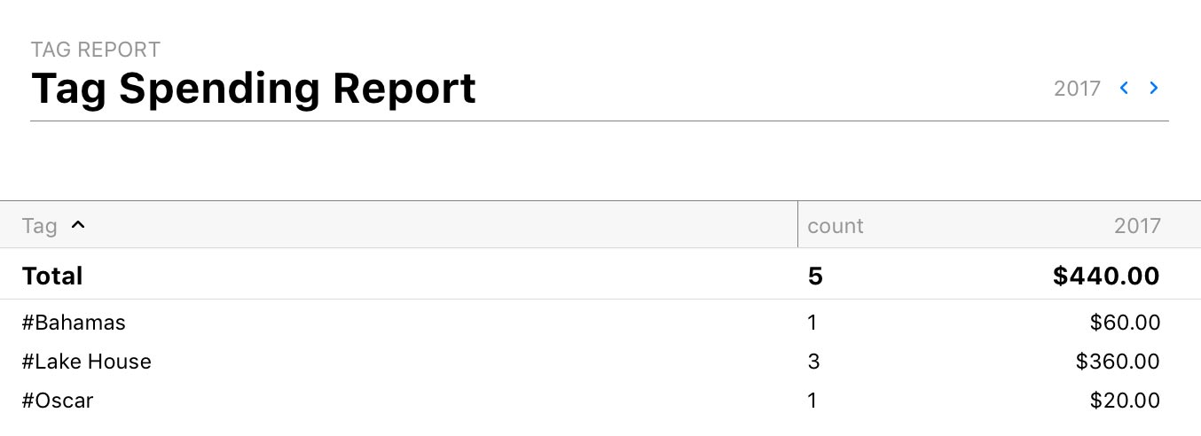 The Tag Spending report type is used to quickly summarize your tags within a specific period of time. It is a simple way to analyze your spending based on tags and the transactions and categories they are most often used with.