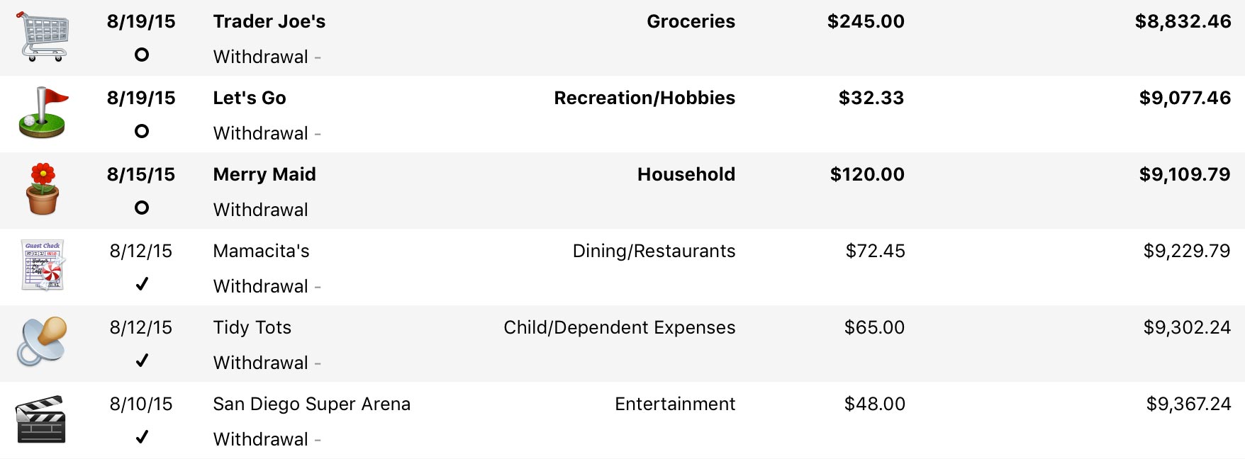 Transactions are what Banktivity uses to store the bulk of your financial data. Transactions are kept under each account you set up, and they represent deposits, withdrawals, transfers, and all other financial exchanges that take place in real life and normally appear on statements from your financial institution. For example, a visit to the ATM, an online account transfer, a grocery store purchase made with a debit card, and a check written to pay a bill can all be recorded in Banktivity as transactions.