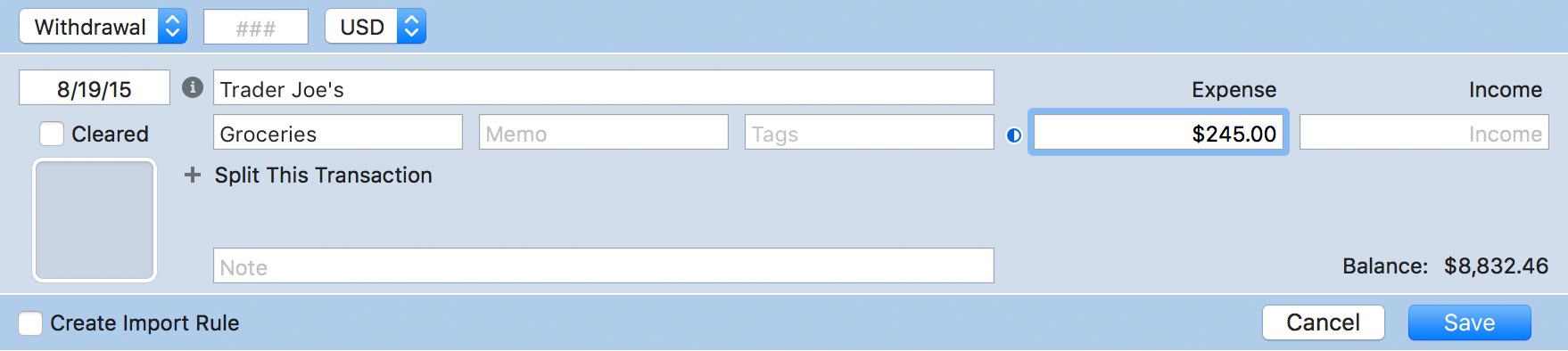 To enter transactions as efficiently as possible, use keyboard shortcuts. You can add new transactions by typing Command-N on your keyboard, then use the Tab key to quickly cycle through each field and enter the transaction details. Press Enter to save the new transaction, type Command-N for another new transaction, and continue on in this manner.