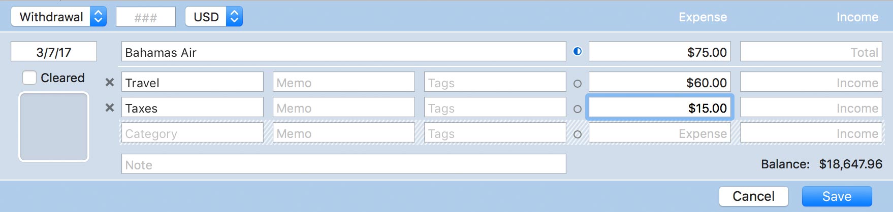 The editor can be used to record basic transaction properties such as the type, number, date, payee, note, and withdrawal or deposit amount (for a descriptive list of all properties, see Transaction Properties). It can also be used to categorize, tag, and split transactions, record account transfers, enter investment details, track cleared/reconciled status, attach files, and record currency information (refer to the articles about these topics for more information).