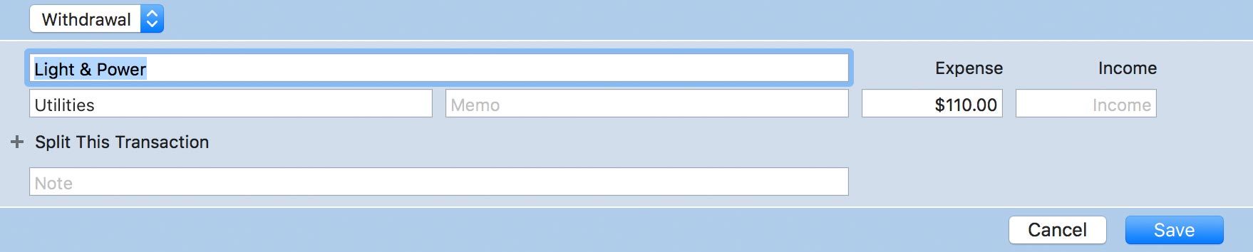 - Consider that you set up a memorized payee to represent your paycheck. Once a month, a paycheck is deposited into your checking account, and though the amount of payment varies, you always put $100 into your savings account. In Banktivity, you would set up a payee with an estimated total amount (your net pay) and two split items: one with the amount of your gross pay, and one to transfer $100 into savings. The gross pay is variable, and the transfer is fixed, so you check off the transfer and leave the gross pay item unchecked. When it comes time to record your paycheck, you create a new transaction in your checking account, autofill the details, and then adjust the main transaction amount. Banktivity automatically adjusts the split item with your gross pay, and leaves the transfer at $100.