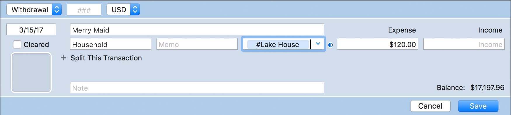 New Banktivity documents do not start with any tags. In an account register, create a transaction or edit an existing one, and type any tag name you like in the tag field. Tag names may contain spaces and special characters, but the hash (#) character is not allowed. Banktivity automatically marks tags with hashes to distinguish them from categories.